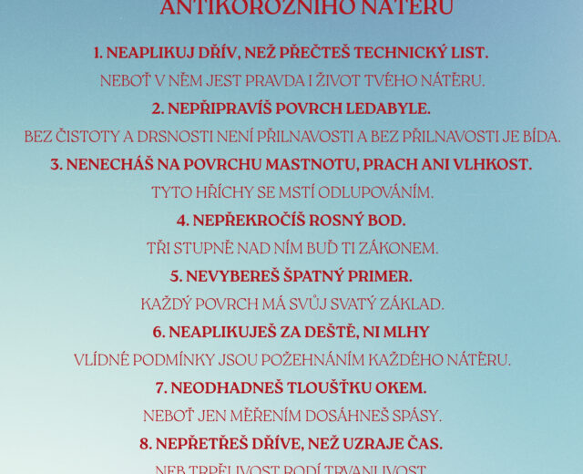 Správná aplikace antikorozního nátěru není otázkou náhody, ale důsledného dodržení osvědčených zásad. Připravili jsme Desatero lakýrníka – stručný, ale výstižný průvodce tím nejdůležitějším, co by měl každý profesionál vědět